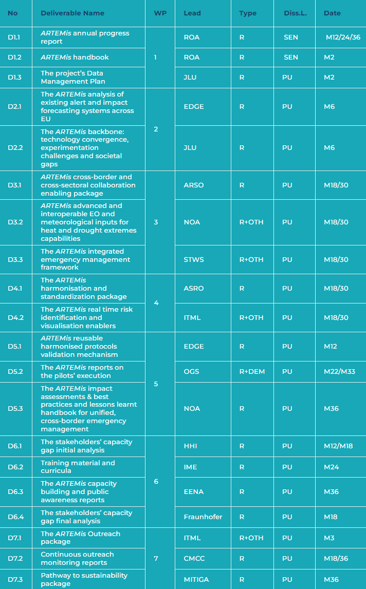 | D2.1 | The ARTEMis analysis of existing alert and impact forecasting systems across EU | 2 | EDGE | R | PU | M6 |